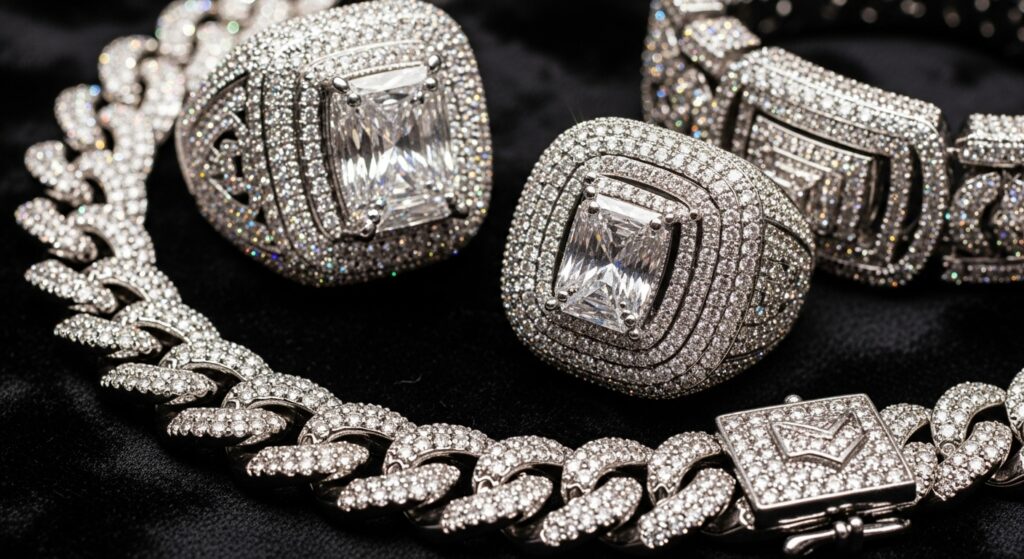 While mixing metals is a trend in high fashion, the iced out aesthetic usually looks cleanest when you stick to one metal tone. If you are rocking a white gold chain, pair it with a silver-tone watch and white gold rings. This creates a uniform “sheet of ice” effect that looks polished and intentional.